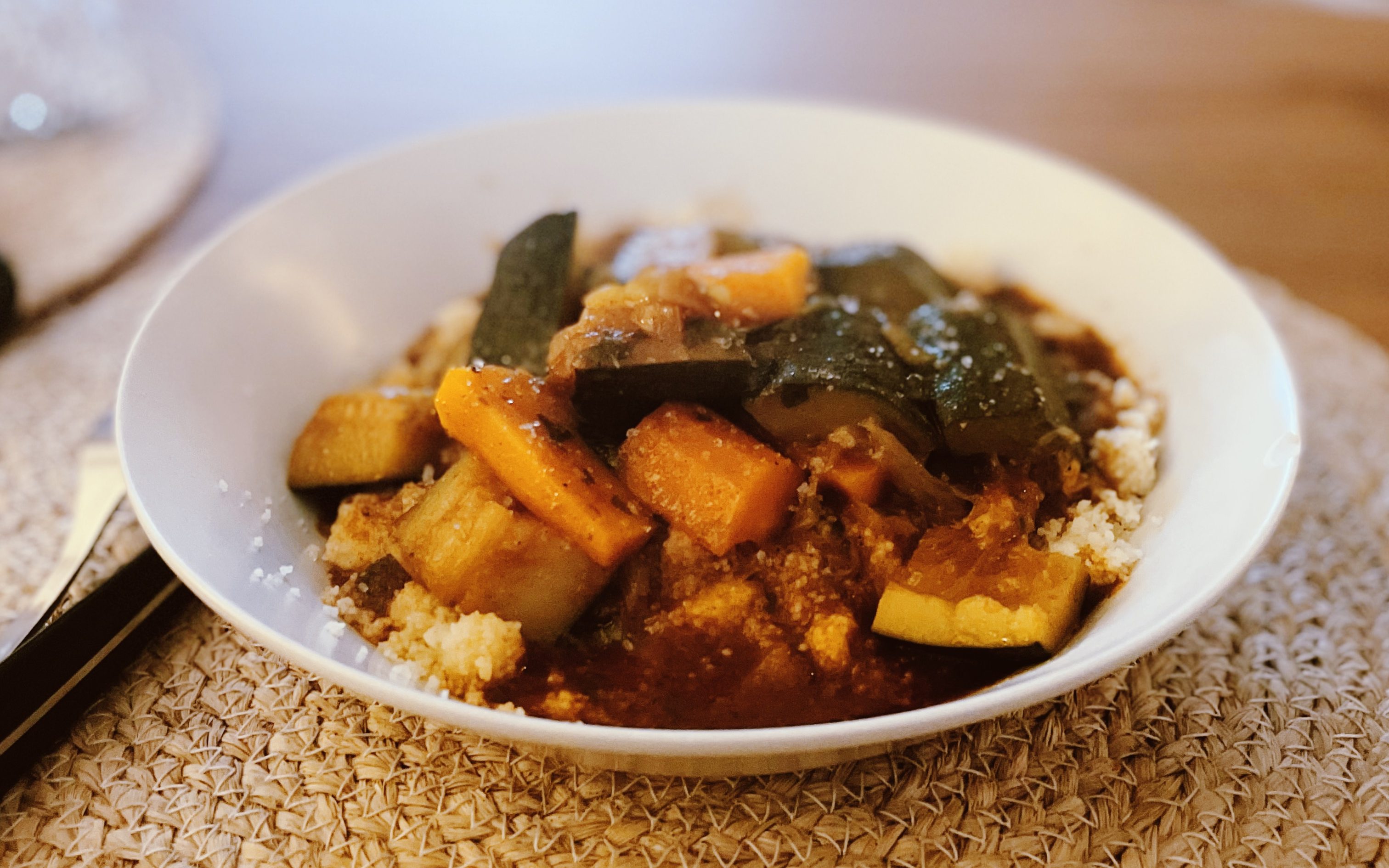 2. Faire revenir 2 minutes les légumes coupés en cubes dans un fait-tout avec un peu d’huile d’olive. Commencez par l’oignon, puis les carottes, le navet et enfin les courgettes. Ajoutez les épices, le concentré de tomate, le bouillon et les raisins secs (facultatif), puis arrosez d’eau à hauteur. Il faut que les légumes soient entièrement recouverts.