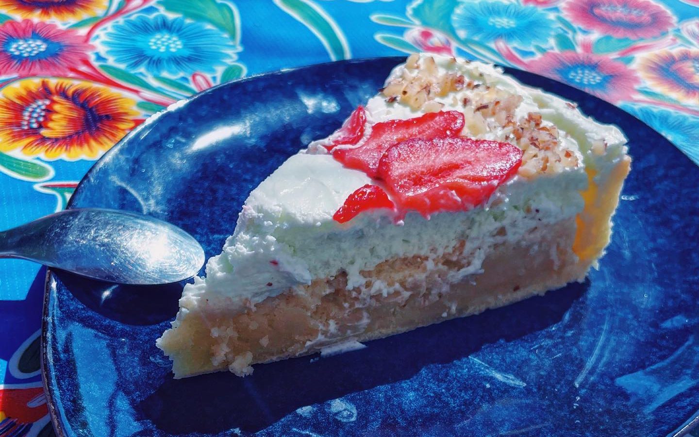 6 Dresser. Étaler la chantilly sur la crème d’amande. Ajouter les fraises coupées en lamelles par dessus. Puis les morceaux de pralin.
