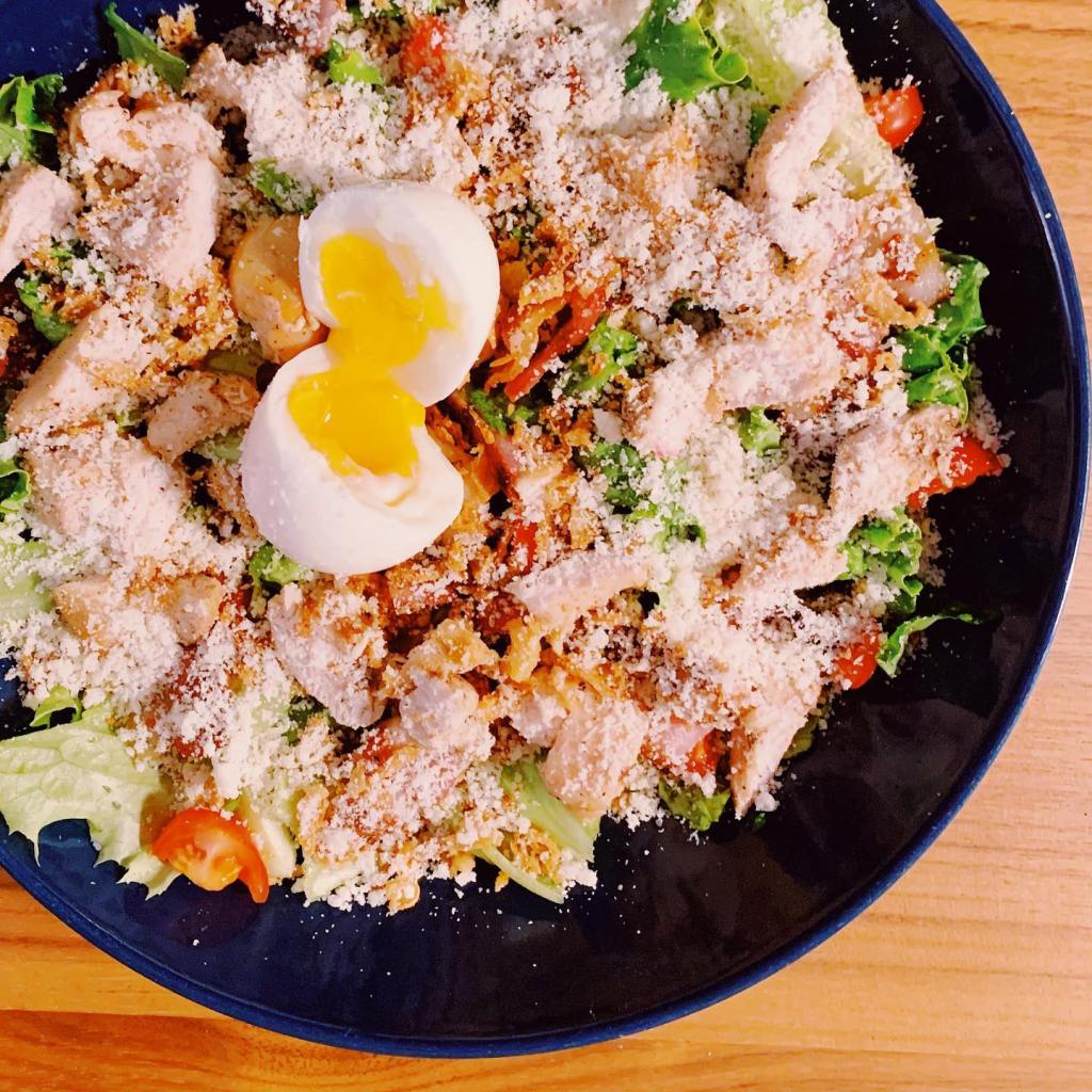 3. Dresser l’assiette. Commencer par la salade, puis disposer les tomates cerise, la poitrine fumée, les morceaux de poulet. Saupoudrer (d’une tonne) de parmesan. Finir en posant l’œuf coupé en deux pour que le jaune coule bien sur le dessus. Mettre la sauce. Se régaler.