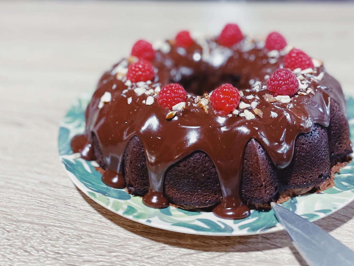 7. Pour le nappage, faire fondre du beurre avec une tablette de chocolat au lait, verser sur le dessus du cake une fois qu’il est tiède. Parsemer d’amandes concassées et de framboises fraîches.