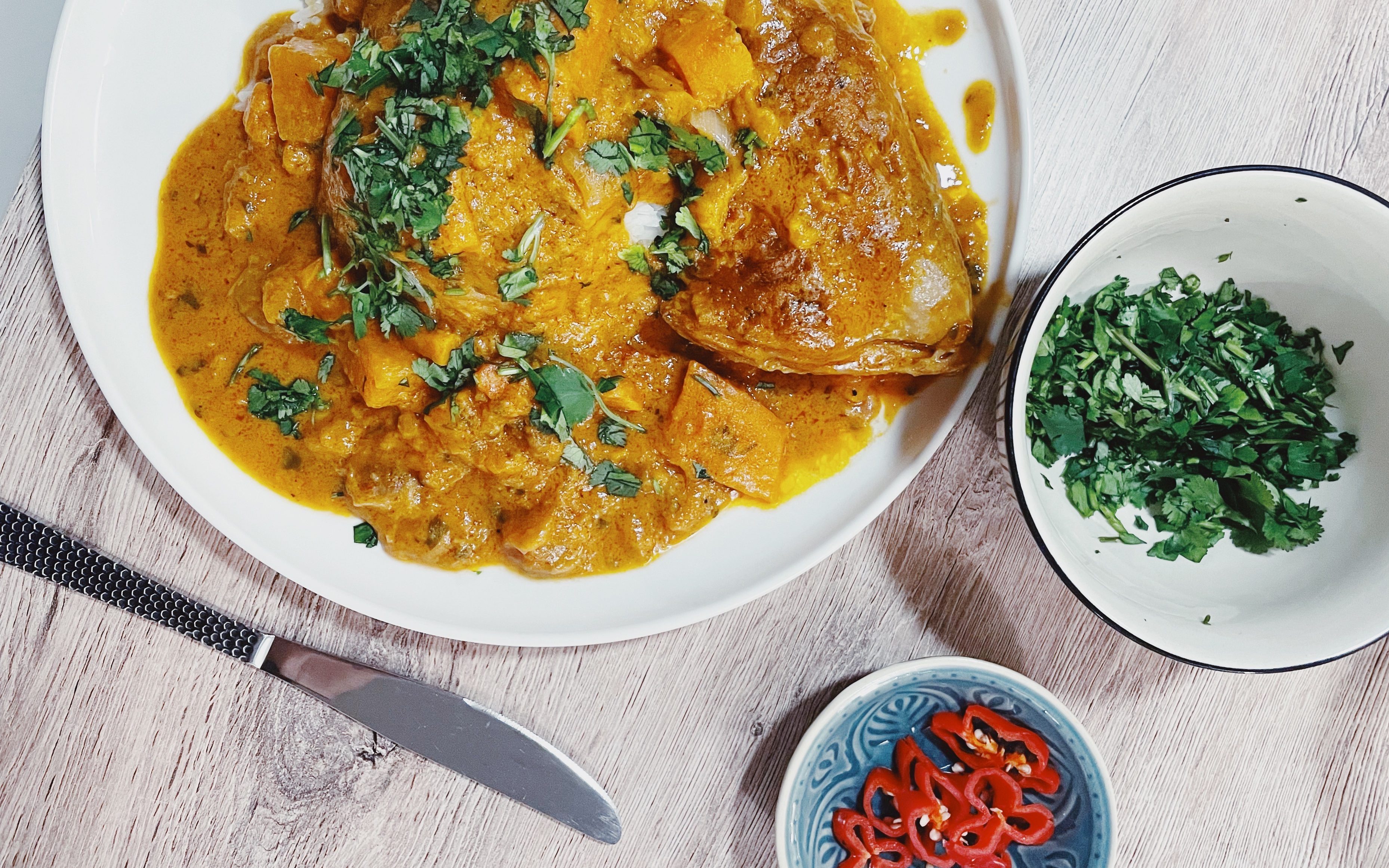 5. Avant de servir, ciseler la coriandre et couper le piment en lamelles. Servir dans des bols à côté.