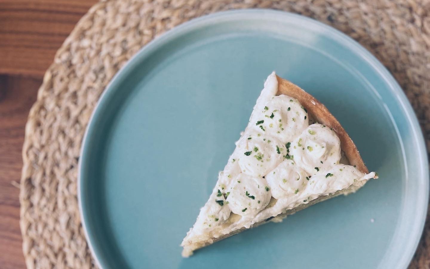 9. Dresser la chantilly sur le curd à l’aide d’une poche à douille. Zester le combava sur le dessus.