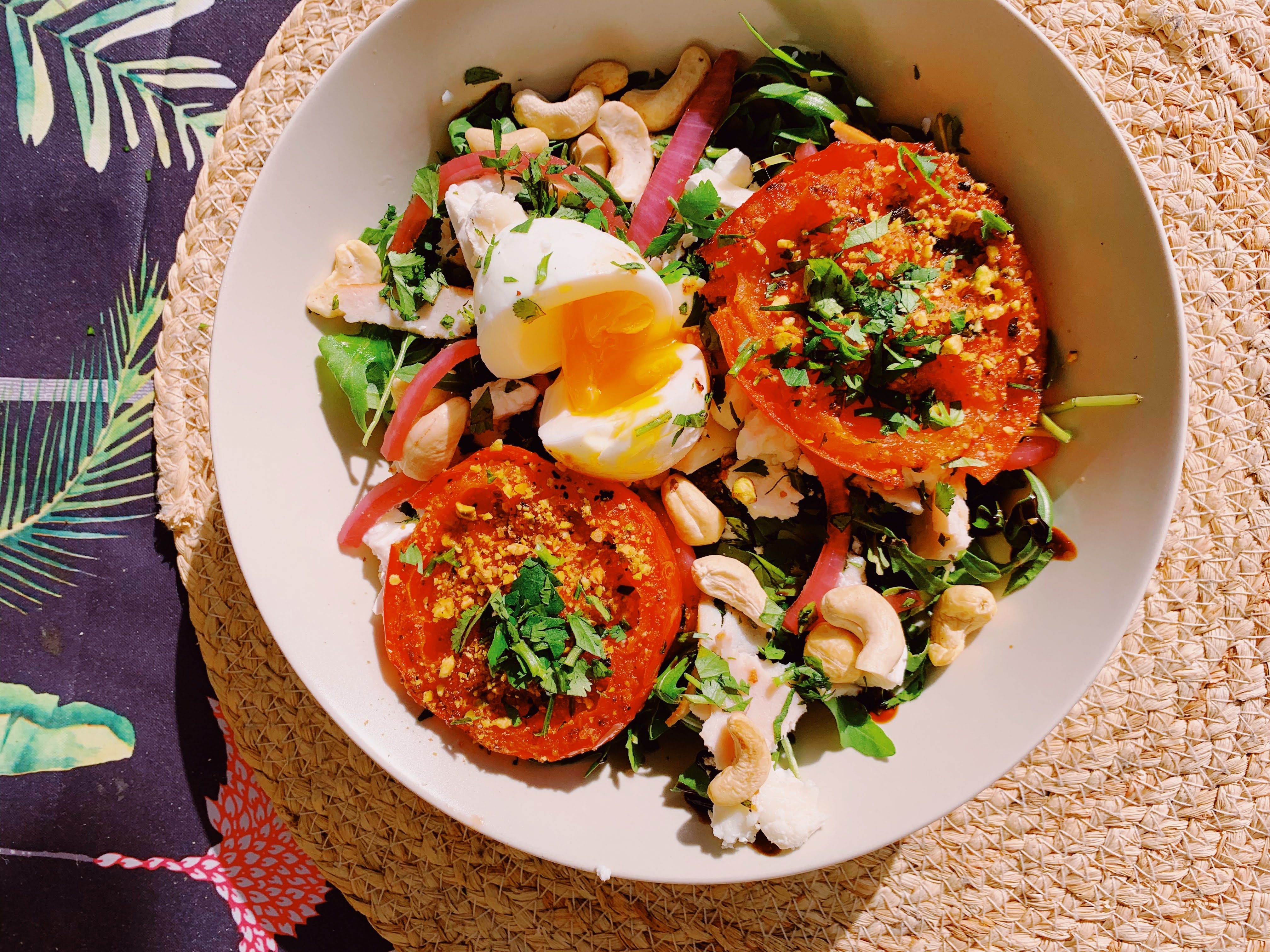 Ma recette de tomates à la provençale sont un mélange de chaud / froid. Je les décline en salade, mais elles peuvent aussi être parfaites en accompagnement. elles sont servies avec un œuf mollet, des noix de cajou, du fromage de chèvre frais et des oignons pickles, qui ajoutent un côté sucré et acidulé.