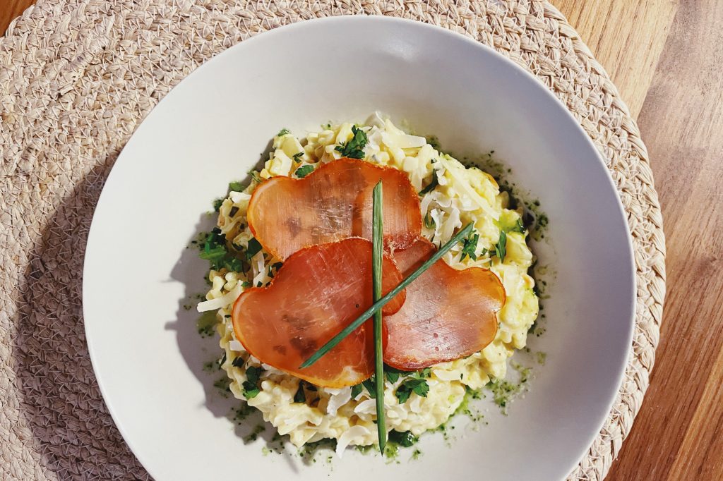 6. Pour le dressage, prenez une assiette creuse ou un bol. Disposer le risotto, ajouter du manchego fraîchement râpé, un peu persil. Ajouter un peu d’huile de persil sur le dessus (vous pouvez prendre un biberon de cuisine et faire des « cercles »). Ajouter les tranches de lomo sur le dessus et disposer deux tiges de ciboulette pour la déco !